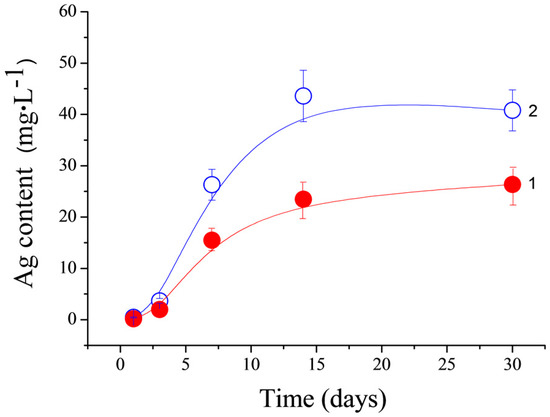 Silver-ion release from cement samples into TRIS-HCl buffer solution during 30 days of immersion (CPC-Ag 0.6 wt % (1) and CPC-Ag 1.0 wt % (2)).
