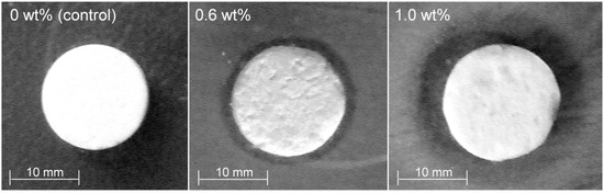 All three proposed cement formulations were tested for antibacterial properties. The reading of the agar plates was made at 24 h and 48 h. The inhibitory effect was proved by the formation of circular, clear zones of inhibition around the disks (Figure 9). Such effect was not observed for the control sample (CPC-Ag 0 wt %). The measured diameters of the inhibition zones are presented in Table 1. The inhibition zone diameter increased simultaneously with the increase of the Ag+ concentration in the samples. The best efficacy was obtained for the CPC-Ag 1.0 wt % cement. There were no significant differences between the readings at 24 h and 48 h of incubation time.