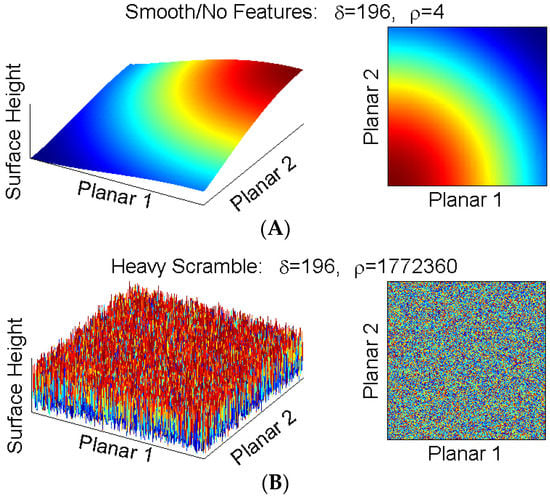 Skewness (δ) and roughness (ρ) for two simulated surfaces. Smooth surface (A) and smooth surface randomly re-configured (“scrambled”) into a rough surface (B). Both surfaces contain the same set of pixels; consequently, δ remains the same in both samples (sample mean μ and standard deviation σ do not change). However, the height differences between adjacent loci are captured via use of the derivative in ρ; as a result, the calculated roughness matches the visual profile.