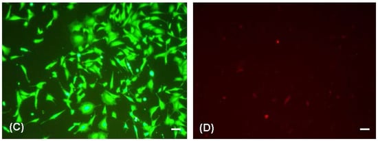 Cell culture on 5 and 10 layered TiO2 nanosubstrates at culture days 7 and 14. Scale bar = 10 μm. (A) Phase contrast microscopic image indicates FC adherence and proliferation at culture day 7on 5 layered TiO2 nanosubstrate; Typical FC morphology (oval and polygonal) observed on the nanosubstrate (B–D) indicate Live Dead Assay images. The green fluorescent dye (Live Dye™) indicates viable FC cell culture and the red fluorescent (propidium iodide) indicates dead cells. (B) Indicates FCs at culture day 7 on 5 layered TiO2 nanosubstrate. (C) And (D) indicates FCs at culture day 14 10 layered TiO2 nanosubstrate.