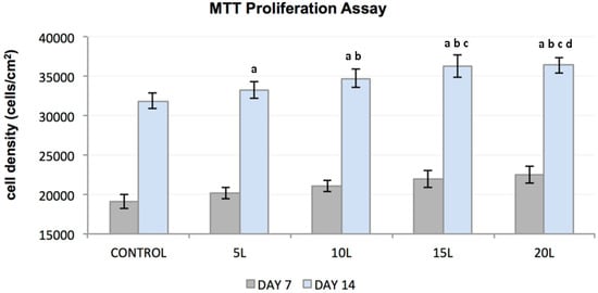 Plot represents FC cell density (y-axis) as a function of control substrates and increasing nanolayers of TiO₂ nanosubstrates (x-axis) at 7 and 14 culture days. All data are shown as mean ± standard deviation, with a sample size of 6 for all substrates. Substrates represented by letters different (a, b, c, d) are considered statistically significant (p < 0.05), using two-way analysis of variance. “a” indicates nanosubstrates that show statistically significant cell numbers w.r.t control substrates. “b”, “c” and “d” indicates nanosubstrates that show statistically significant cell numbers w.r.t 5 L, 10 L and 15 L nanosubstrates respectively.