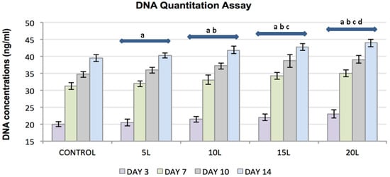 Plot represents DNA concentration of FC lysate samples (y-axis) as a function of control substrates and increasing nanolayers of TiO₂ nanosubstrates (x-axis) at 3, 7, 10 and 14 culture days. All data are shown as mean ± standard deviation, with a sample size of 6 for all substrates. Substrates represented by letters different (a, b, c, d) are considered statistically significant (p < 0.05), using two-way analysis of variance. “a” indicates nanosubstrates that show statistically significant cell numbers w.r.t control substrates. “b”, “c” and “d” indicates nanosubstrates that show statistically significant cell numbers w.r.t 5 L, 10 L and 15 L nanosubstrates respectively.