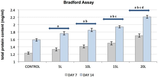 Bradford assay quantified the total protein content produced by different layered (5, 10, 15 and 20) TiO2 nanosubstrates and control substrates at 7 and 14 culture days. The assay essentially made use of Bradford dye, Coomasie@R Brilliant Blue G-250, which exhibited differential color change on binding to various concentrations of protein present in the given samples. Absorbance from the dye-binding calorimetric reaction was measured spectrophotmetrically at a wavelength of 595 nm and, the total protein content was quantified from the standard protein curve established between different concentrations of Bovine Serum Albumin (BSA) and the corresponding absorbance measurements at different BSA concentrations.
