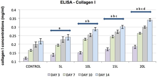 Plot represents FC collagen I concentration (y-axis) as a function of control substrates and increasing nanolayers of TiO₂ nanosubstrates (x-axis) at 3, 7, 10 and 14 culture days. All data are shown as mean ± standard deviation, with a sample size of 6 for all substrates. Substrates represented by letters different (a, b, c, d) are considered statistically significant (p < 0.05), using two-way analysis of variance. “a” indicates nanosubstrates that show statistically significant cell numbers w.r.t control substrates. “b”, “c” and “d” indicates nanosubstrates that show statistically significant cell numbers w.r.t 5 L, 10 L and 15 L nanosubstrates respectively.