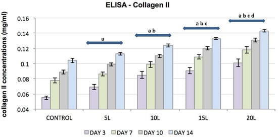 Plot represents FC collagen II concentration (y-axis) as a function of control substrates and increasing nanolayers of TiO₂ nanosubstrates (x-axis) at 3, 7, 10 and 14 culture days. All data are shown as mean ± standard deviation, with a sample size of 6 for all substrates. Substrates represented by letters different (a, b, c, d) are considered statistically significant (p < 0.05), using two-way analysis of variance. “a” indicates nanosubstrates that show statistically significant cell numbers w.r.t control substrates. “b”, “c” and “d” indicates nanosubstrates that show statistically significant cell numbers w.r.t 5 L, 10 L and 15 L nanosubstrates respectively.