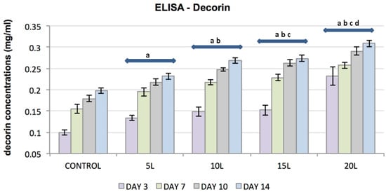 Plot represents FC decorin concentration (y-axis) as a function of control substrates and increasing nanolayers of TiO₂ nanosubstrates (x-axis) at 3, 7, 10 and 14 culture days. All data are shown as mean ± standard deviation, with a sample size of 6 for all substrates. Substrates represented by letters different (a, b, c, d) are considered statistically significant (p < 0.05), using two-way analysis of variance. “a” indicates nanosubstrates that show statistically significant cell numbers w.r.t control substrates. “b”, “c” and “d” indicates nanosubstrates that show statistically significant cell numbers w.r.t 5 L, 10 L and 15 L nanosubstrates respectively.