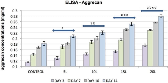 Plot represents FC aggrecan concentration (y-axis) as a function of control substrates and increasing nanolayers of TiO₂ nanosubstrates (x-axis) at 3, 7, 10 and 14 culture days. All data are shown as mean ± standard deviation, with a sample size of 6 for all substrates. Substrates represented by letters different (a, b, c, d) are considered statistically significant (p < 0.05), using two-way analysis of variance. “a” indicates nanosubstrates that show statistically significant cell numbers w.r.t control substrates. “b”, “c” and “d” indicates nanosubstrates that show statistically significant cell numbers w.r.t 5 L, 10 L and 15 L nanosubstrates respectively.