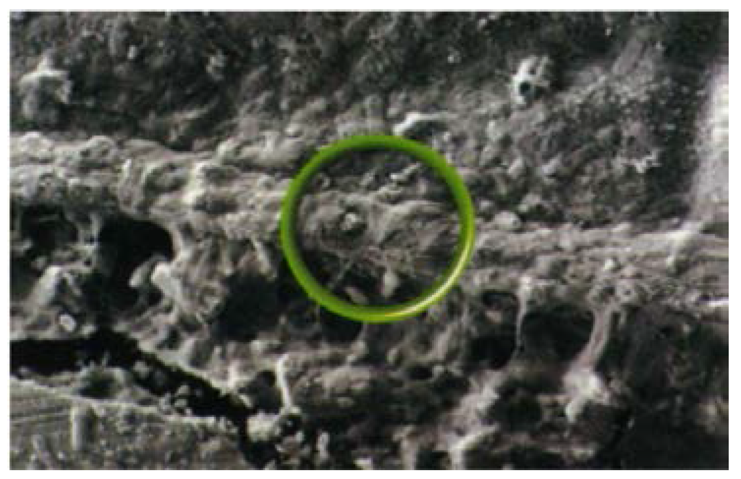 Interfacial ion-exchange layer formed between tooth surface (above) and glass-ionomer cement (below). The circle indicates part of the ion-exchange layer.