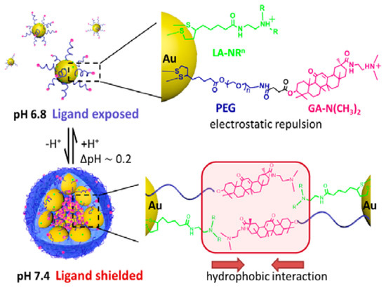 AuNPs are made sensitive to pH by using a polymer that has a different charge at different pH values, by adjusting the SPR, or by combining these two techniques (Table 1). For example, shieldable tumor-targeting AuNPs that possessed a self-assembly/disassembly property triggered by extrinsic pH changes were prepared by surface modification of AuNPs with two other components, lipoyl tertiary amines (LA-NRn) and poly(ethylene glycol) (PEG) modified by a glycyrrhetinic acid (GA) derivative, forming PEG-GA-N(CH3)2 [23]. GA is a targeting ligand of hepatocytes. It also serves as the tuner of hydrophobicity in these AuNPs. The carboxylic acid group on GA was modified into a tertiary amine group, causing the modified GA moiety to transit from non-charged (hydrophobic) to positively charged (hydrophilic) as pH dropped, and LA-NRn underwent a similar transition (illustrated in Figure 1). This hydrophobic/hydrophilic transition resulted in the aggregation of the AuNPs and the hiding of the targeting ligand at pH 7.4, and disassembly and exposure of the targeting ligand at acidic pH (such as 6.8). The results of an in vitro study showed that the uptake of AuNPs@LA-NR4+PEG-GA-N(CH3)2 by HepG2 cells was about three times higher at pH 6.8 than at pH 7.4. Aside from the incorporation of a polymer/compound that has a different charge at different pH values, chemical bound that is prone to hydrolysis has also been used to introduce pH sensitivity. The hydrolysis of the citraconic amide moiety triggers the release of doxorubicin (Dox) to the tumor area and spurs the aggregation of AuNPs for photothermal therapy [24].