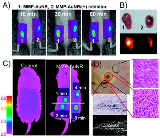 The intrinsic properties of AuNPs have also been incorporated into the design to facilitate ablation. For example, MMP-sensitive gold nanorods (MMP-AuNRs) were designed for simultaneous imaging and photothermal ablation for cancer [41]. The peptide sequence GPLGVRGC was used to link a near-infrared (NIR) fluorescent (NIRF) dye, Cy5.5, onto the surface of AuNRs. This peptide sequence could be degraded by MMP. In the resulting MMP-AuNRs, the NIRF was quenched until the peptide was cleaved by MMP and the Cy5.5 was released. To avoid tissue absorption, the AuNRs’ aspect ratio was adjusted so that the strong absorption was tuned to the NIR region. Conjugation with the Cy5.5 peptide sequence did not change the stability or photothermal properties of the MMP-AuNRs. Incubation of MMP-AuNRs with MMP-3, -7, -9, and -13 resulted in increased fluorescence, though MMP-7 treatment did not increase the fluorescence as much as the rest of the MMPs. After irradiation with a continuous-wave laser at 671 nm for 10 minutes, MMP-AuNR-treated cells underwent cell damage and apoptosis. The in vivo efficacy of MMP-AuNRs was also demonstrated on SCC-7 tumor xenografts on nude mice. Enhanced NIRF was observed after intratumoral injection of MMP-AuNRs. Maximum NIRF was observed 60 minutes after the injection. Pre-injection of an MMP inhibitor reduced the NIRF. Hyperthermal therapy was also administered, with tumor temperature increasing by more than 45 °C after 4 minutes of treatment. More tumor cell damage was observed in the group of mice co-treated with MMP-AuNRs than in the group treated with hyperthermal therapy alone (Figure 2).