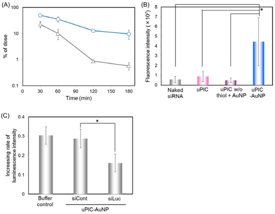 (A) Blood circulation property of uPIC-AuNPs (open circle) and bare AuNPs as a control (open triangle) determined by ICP-MS. Results are expressed as mean and standard deviation (n = 3–4); (B) Subcutaneous HeLa-Luc tumor accumulation of Alexa-siRNA delivered by each formulation at 4 h after intravenous injection (4.8 μg siRNA/mouse), determined by IVIS. Results are expressed as mean and standard deviation (n = 4, * p < 0.01); (C) Increasing rate of luminescence intensity (IRLI) from subcutaneous HeLa-Luc tumors after treatment with siLuc- or siCont-loaded uPIC-AuNPs (5.8 μg siRNA/mouse/shot) or a Hepes buffer control. The IRLI values were calculated as an indicator of luciferase gene silencing activity, as described in the Materials and Methods. Results are expressed as mean and standard error of the mean (n = 4, * p < 0.05). Reprinted with permission from [54]. Copyright American Chemical Society, 2014.