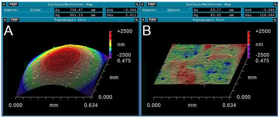 Wininger illustrated how the jerk parameter can be used to distinguish between two very different surface formations both with the same skewness. In this example one surface was smooth but inclined; the other was a random rearrangement of the heights showing a relatively level but rough surface. This example demonstrates the problems encountered by metrologists when dealing with profiles that are not flat. In our study we used the software MetroPro (Zygo Corporation, Middlefield, CT, USA), which has an in-built feature capable of accounting for spherical or cylindrical profiles. Take for instance a spherical surface that has not yet been corrected (Figure 2A). The high apex and the low slopes are merely read as relative heights and are subsequently used to calculate false roughness parameters. Once the spherical profile has been negated (Figure 2B) it is possible to quantify the true topography of the surface. Note the difference in the Sa; Sq; Ssk and Sku values presented in Figure 2A,B.