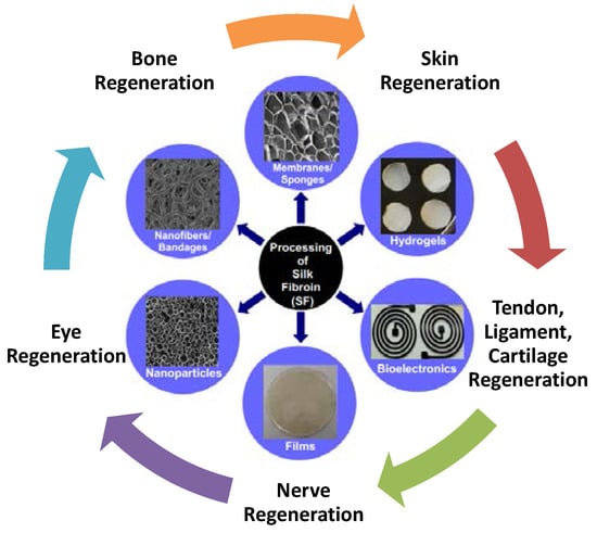 - Kundu, B.; Kurland, N.E.; Bano, S.; Patra, C.; Engel, F.B.; Yadavalli, V.K.; Kundu, S.C. Silk proteins for biomedical applications: Bioengineering perspectives. Prog. Polym. Sci. 2014, 39, 251–267. [Google Scholar] [CrossRef]
