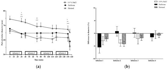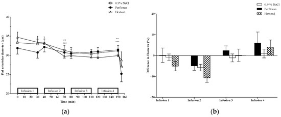 Medium-sized pial arterioles (50–100 µm). (a) Pial arteriolar diameters (mean ± SE) from rats treated with Perftoran (N = 34 arterioles from 13 rats), 0.9% NaCl (N = 56 arterioles from 13 rats), or Hextend (N = 51 arterioles from 12 rats). Test solutions were administered as four sequential 30 min IV infusions. The final data point for each treatment is vessel size after topical application of the vasoconstrictor BaCl2. Statistically significant (p ≤ 0.05) change in vessel diameters comparing pre- vs. post-infusion values in the Perftoran (#) group was observed at the end of the first (T30) infusion and at the end of the first (T30) and second (T70) infusions for 0.9% NaCl (##) and Hextend (###) groups. There was a significant cumulative change (T0 vs. T150) in vessel diameter within the Perftoran (*), 0.9% NaCl (**), and Hextend (***) groups; (b) Percent change of vessel diameters (mean ± SE) was determined using pre-infusion and post-infusion for each infusion separately. There were no differences in percent change among the three treatment groups for any of the infusions.