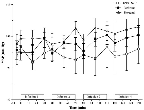 HR was significantly different among the groups at baseline (T0) but was still within the normal range for rats under the anesthesia regimen used in this study [13,14,15,16,17] and did not exhibit any cumulative change (comparing T0 to T150) over time within any of the groups (Table 1). The only significant change in HR after an individual infusion was a slight transient increase in the 0.9% NaCl group after the third infusion. Among the groups, HR was significantly lower in the 0.9% NaCl group than the Perftoran group after each of the four infusions (i.e., T30, T70, T110, and T150) and was lower than the Hextend group after the first (T30) and third (T110) infusions. Heart rates in the Perftoran and Hextend groups were not different from each other at any point during the experiment.