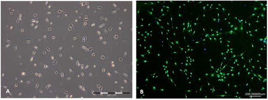 Schwann cell (SC) culture during purification process in vitro. (A) Schwann cells in vitro in a subconfluent culture; (B) Staining of Schwann cells with characteristic marker S100 (green), counterstained with 4′,6-diamidino-2-phenylindole (DAPI). The determined purity was 96.96%.