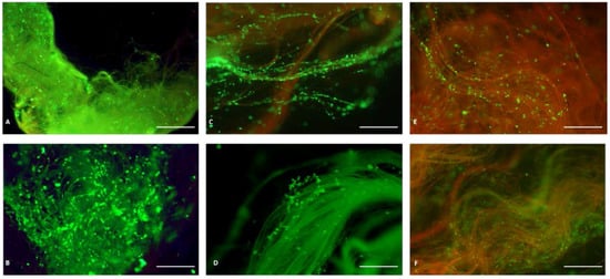 Viability assay of spider silk nerve construct seeded with Schwann cells and cultured after 7 and 21 days of observation. Pre-settled spider silk nerve conduits were cultured for 7 and 21 days. Green cells are vital. Spider silk autofluorescence are shown orange-red. The number of cells increased by proliferation from day 7 to day 21 on a 4.0 cm construct (A,B). Diffuse population of Schwann cells on a 10.0 cm construct (C) increased during observation time of 21 days (D). On the 15.0 cm construct, at 7 days only a few SCs could be observed (E) but upon intense proliferation, the spider silk construct was fully populated with SC after 21 days (F). Cells are highly vital (green), indicative of sufficient nutritive substances in the central segments of the 15.0 cm spider silk nerve conduit. Scale bars in A–F pertain to 500 µm.