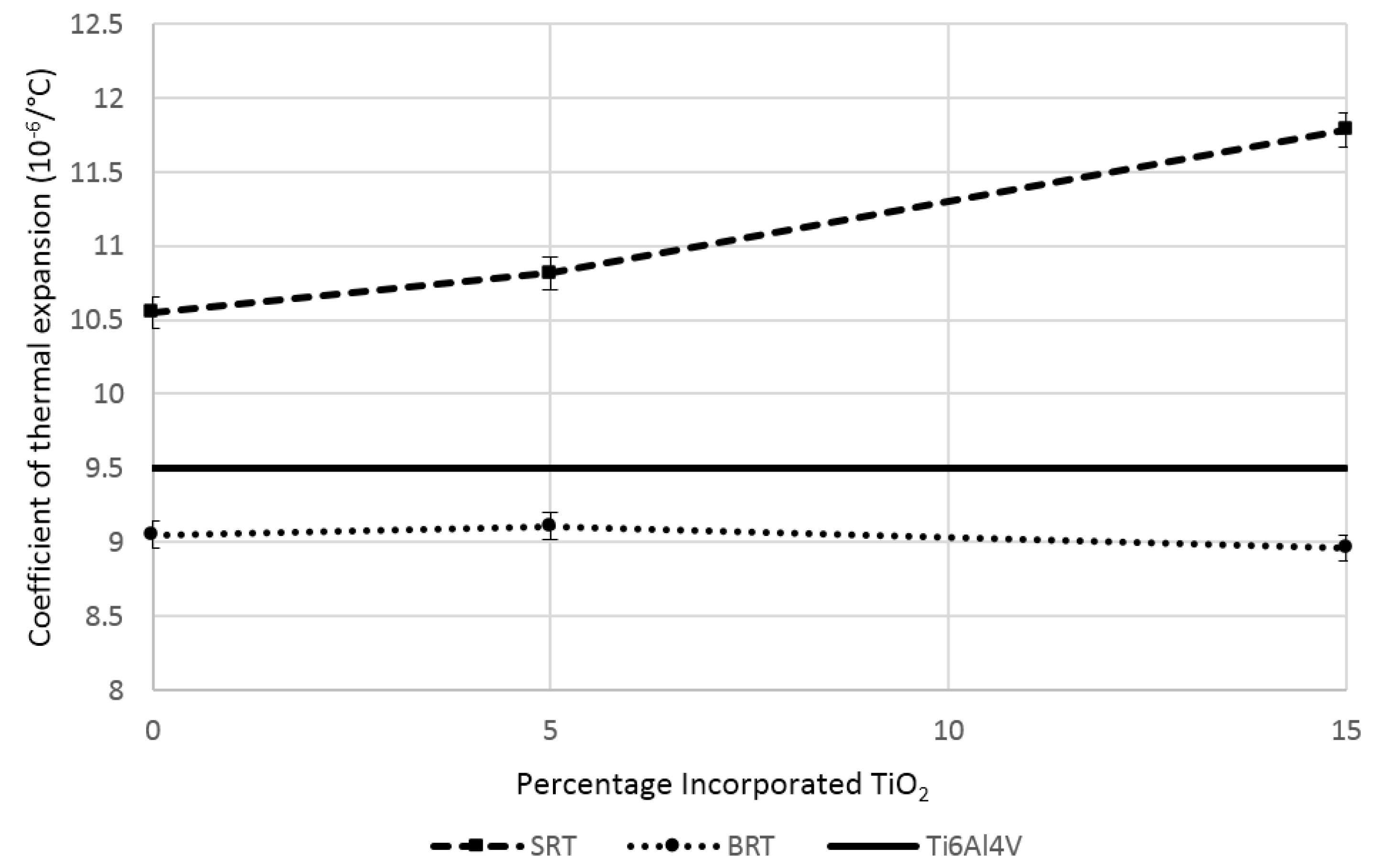 Results from the measurement of the CTE are found in Figure 1 for the SRT (silica-based) and BRT (borate-based) glass series. The CTE of the silica-based glasses were found to be consistently greater than the CTE of Ti6Al4V, with the percentage difference ranging between 11.1% and 24%, whereas the CTE for the borate-based glasses were found to be below the CTE of Ti6Al4V with a smaller percentage difference, ranging between 4.1% and 5.8%. In statistical terms, the CTE for all borate-based glasses were found to be equivalent; the CTE for SRT0 and SRT1 (0 and 5 mol% incorporated TiO2) were also found to be equivalent.