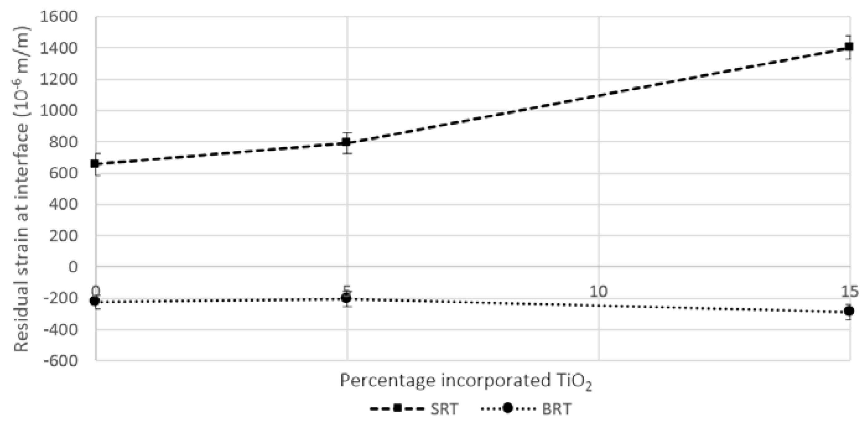 Residual strain results (Equation (3)) are shown in Figure 2, where it can be seen that, in terms of the magnitude, greater strains were experienced when the silica-based coatings were employed, opposed to borate-based ones. This is due to higher CTE mismatch between the silica-based glasses and the titanium substrate, especially for the case of SRT3 (15 mol % incorporated TiO2). Residual stress in the glass coatings (Figure 3) at the interfacial site (Equation (4)) were found to follow a similar trend as the residual strains, with borate-based glasses exhibiting compressive residual stresses and silica-based glasses exhibiting tensile residual stresses.