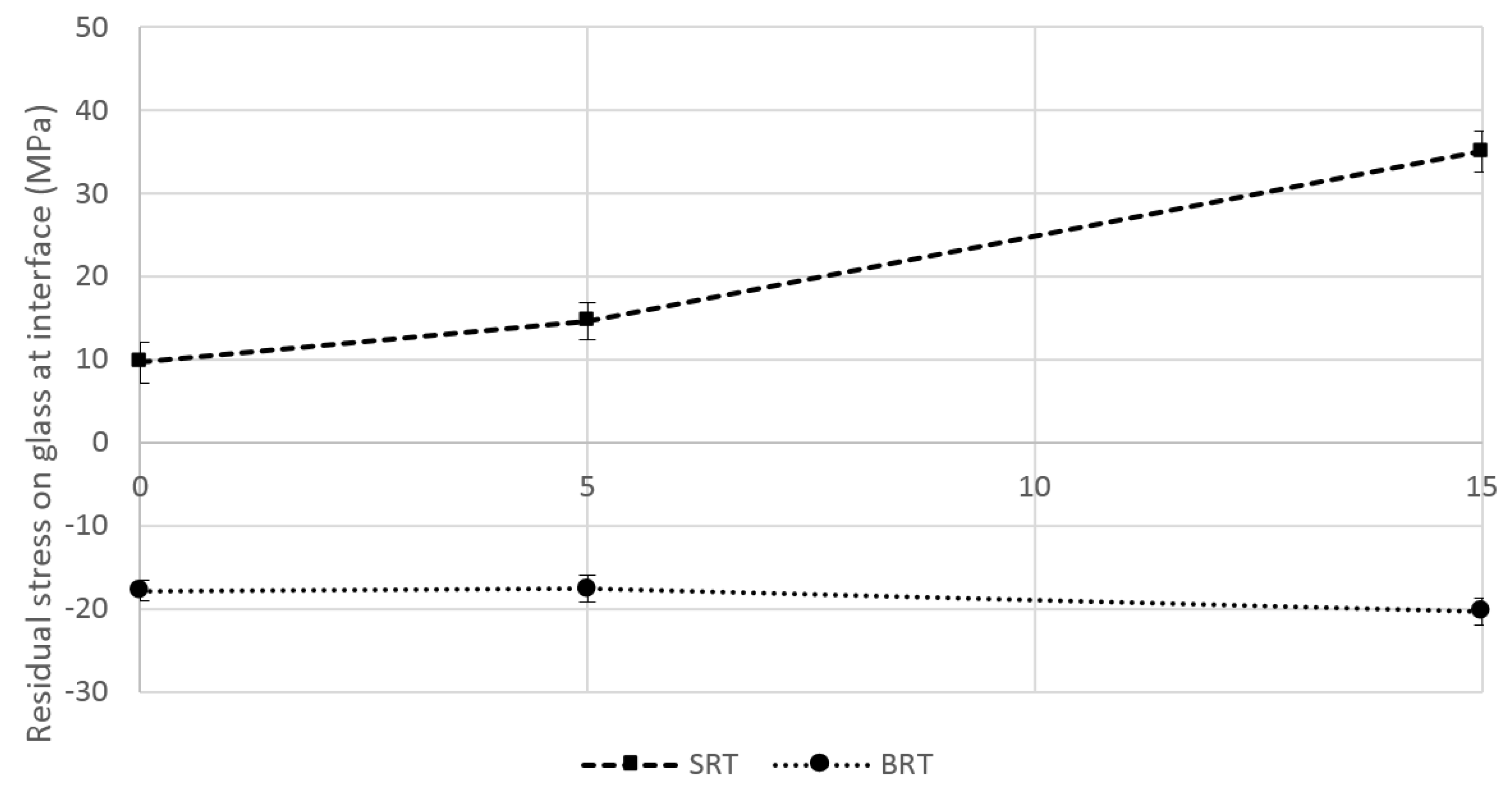 Residual stresses experienced in the glass coating at the coating/substrate interface using the SRT and BRT glasses as coatings. Scatter bars indicate one standard deviation from the mean.