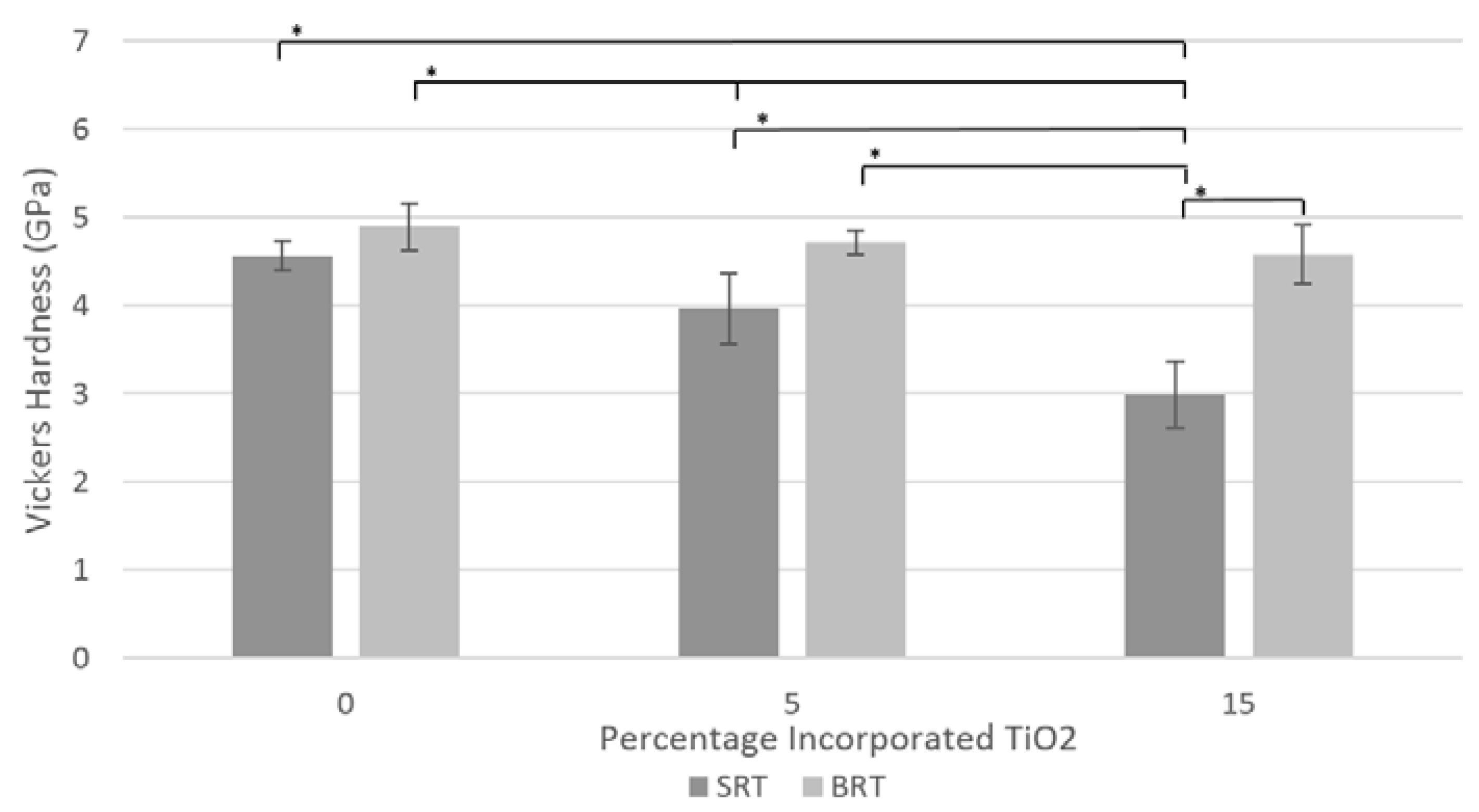 Vickers hardness for the SRT and BRT glasses. Scatter bars indicate one standard deviation from the mean. Stars and bars show statistical significance (p < 0.05).