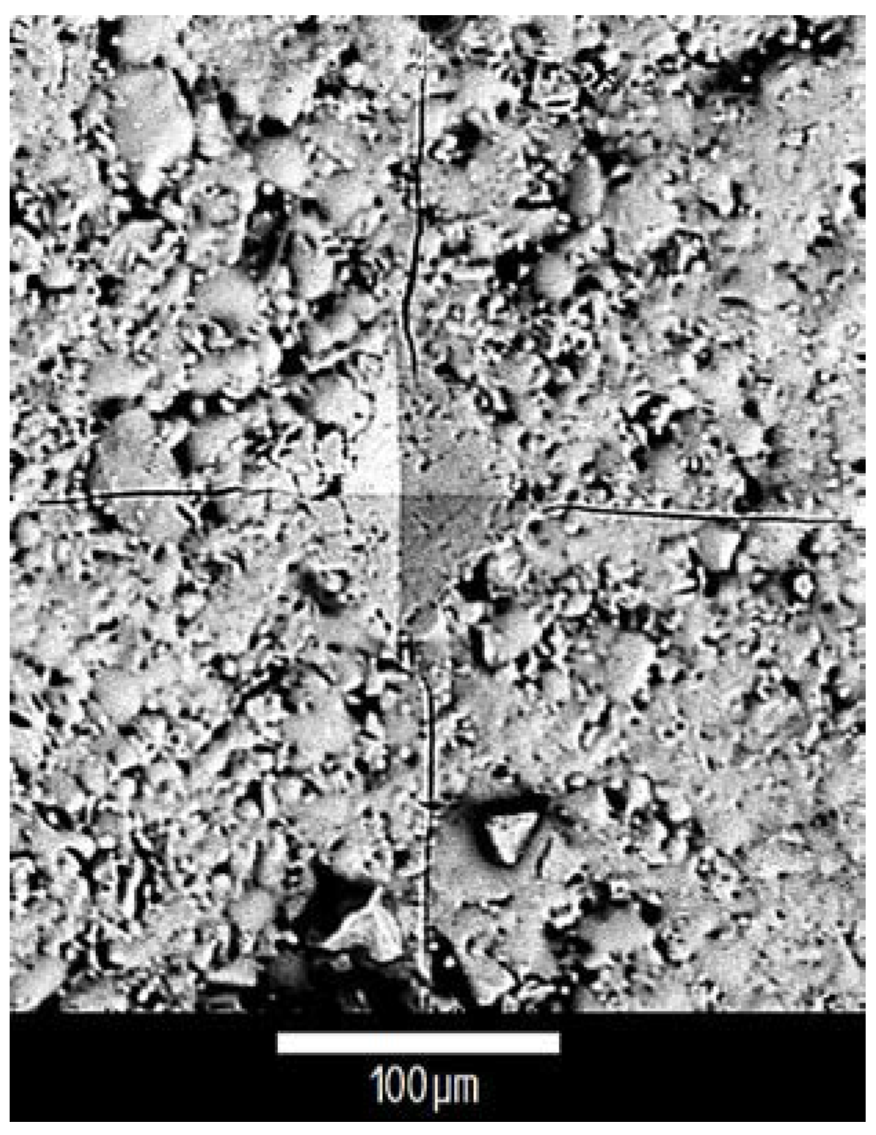 SEM of a Vickers indent on SRT0 with the emanating cracks. The average half diameter and crack length are 54.8 μm and 187.9 μm, respectively.