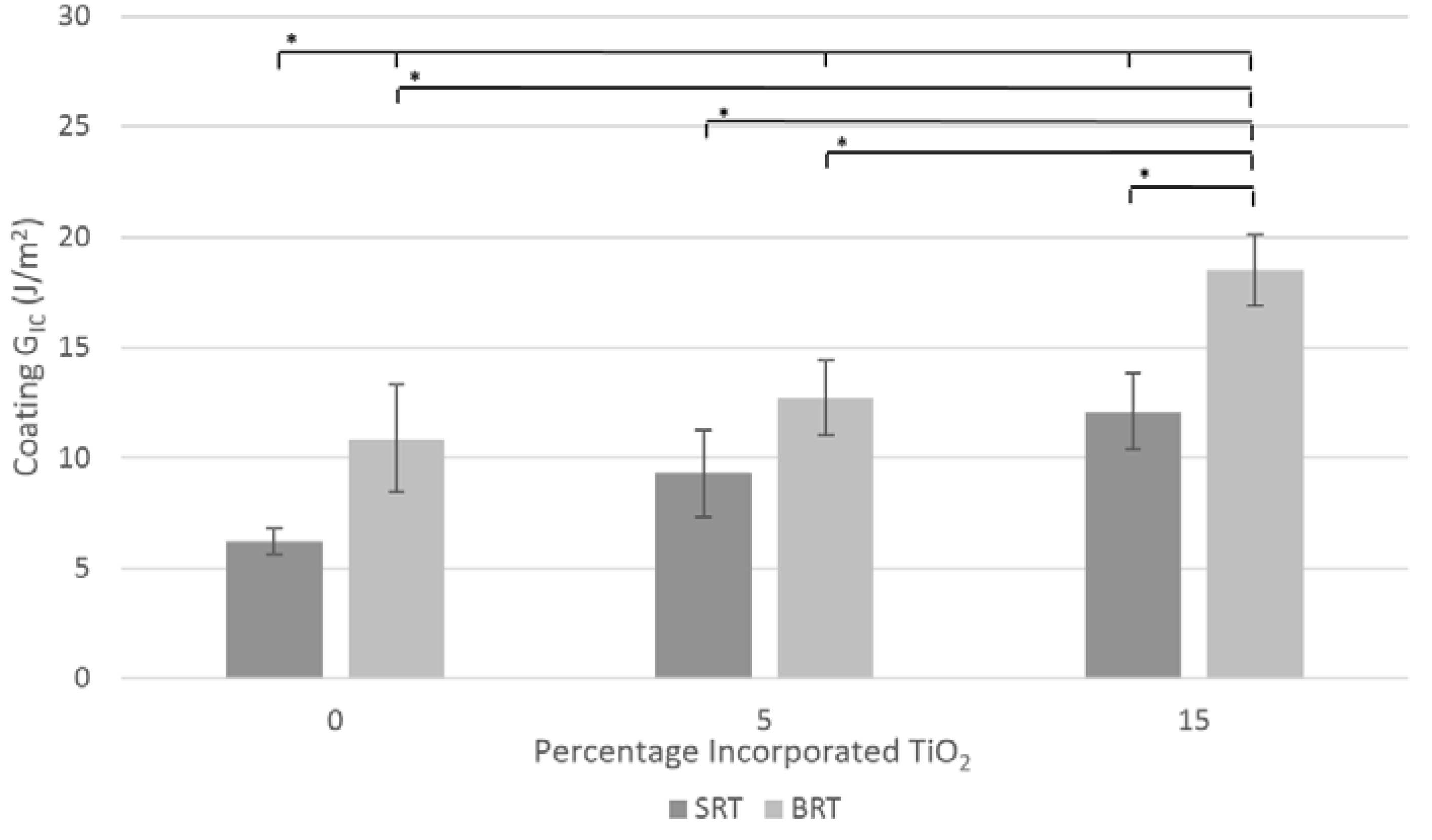 Mode I critical strain energy release rates for the coating/substrate systems with SRT and BRT glasses. Scatter bars indicate one standard deviation from the mean. Stars and bars show statistical significance (p < 0.05).