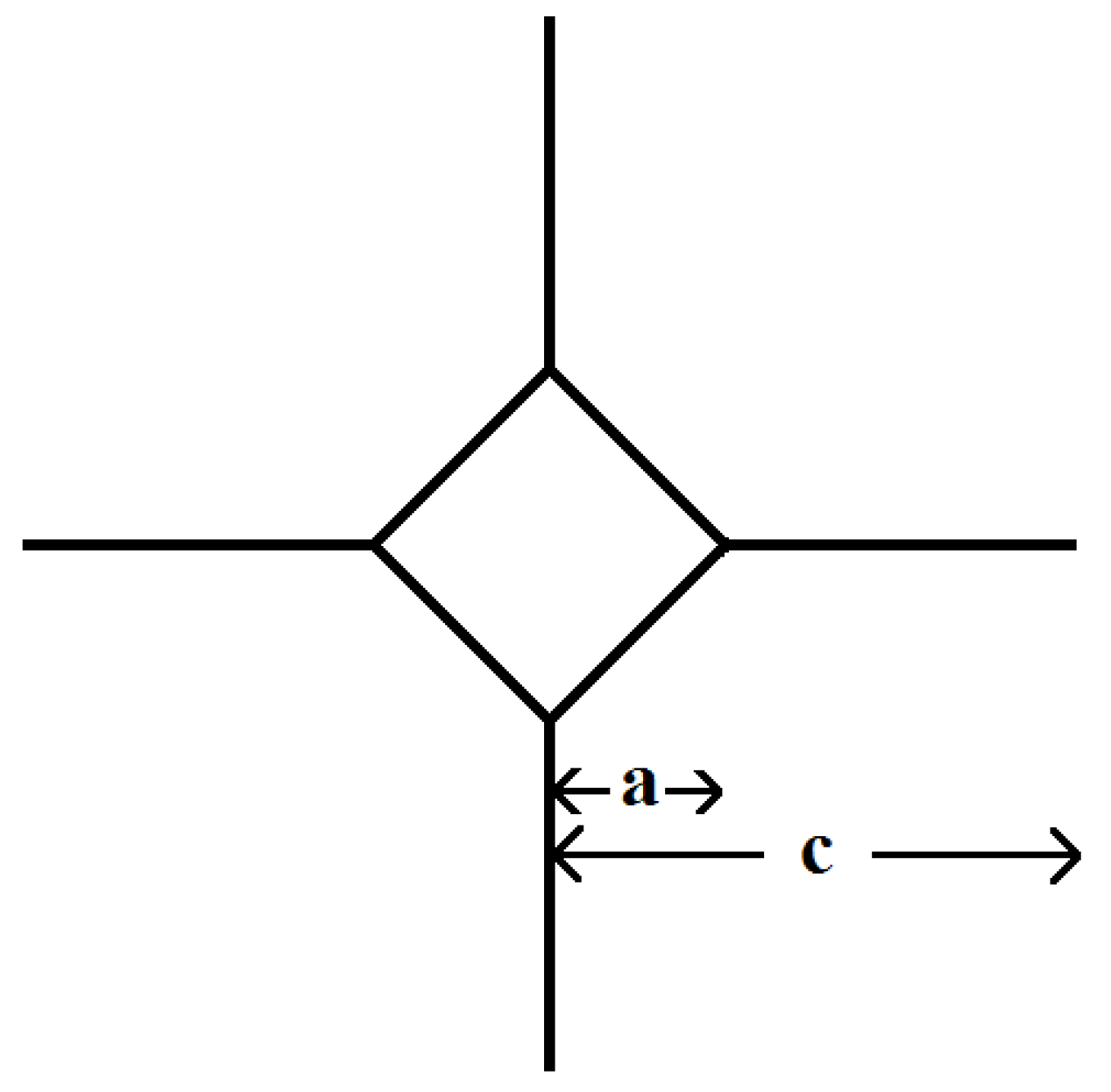 Schematic depiction of the cracks emanating from a Vickers indent. a is half of the diameter length of the dent, and c is the crack length measured from the center of the indent.