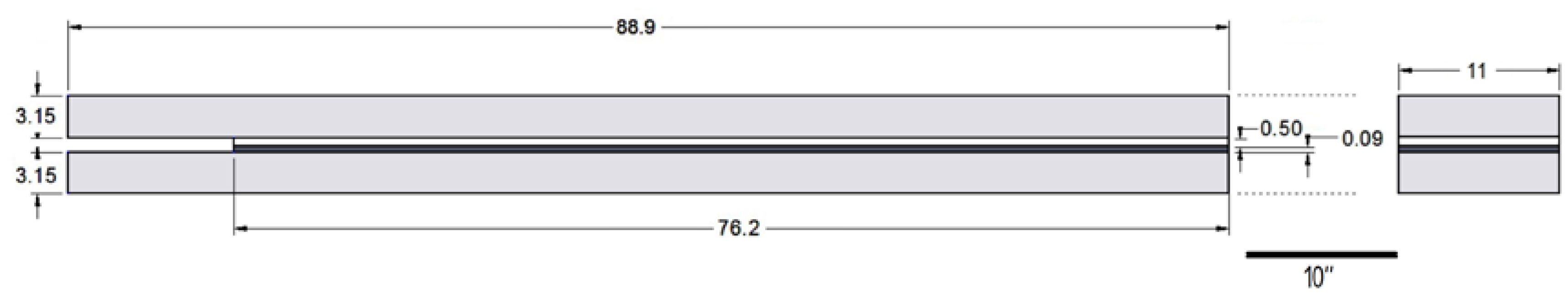 Bi-layer double cantilever beam specimens. All units are in millimeters. Gray materials represent the titanium alloy substrates, black material represents the glass, and white material represents the epoxy.