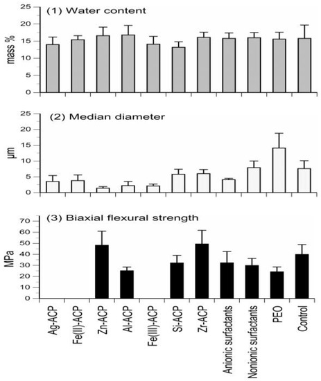 Effects of additives (cations, surfactants, and polymers) on ACP filler’s water content (upper panel), particle size (middle panel), and mechanical strength (lower panel) of the Bis-GMA-based composites. Indicated are mean values + standard deviation (SD) for three or more repetitive runs in each experimental group.