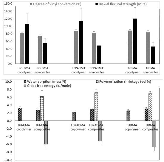 Generally, all experimental copolymers and composites attained relatively high levels of DVC 24 h post-curing. The values were 81.4%–88.6% and 73.5%–83.9% in copolymer and composite series, respectively (Figure 2; upper panel). Introduction of ACP filler into resins resulted in modest, though highly significant (two-sample independent t-test), reduction of DVC in all systems: 9.7% in the Bis-GMA group (p < 0.0000001), 7.1% in the EBPADMA group (p < 0.000003), and 5.4% in the UDMA group (p < 0.00007). Inter-group comparisons revealed a consistently lower DVC values in Bis-GMA- vs. EBPADMA- and/or UDMA-based formulations in copolymer series (7.3%–8.2% reduction; one-way analysis of variance (ANOVA): p < 0.0001) and (9.0%–12.4% reduction; one-way ANOVA: p < 0.0001) in composite series. The BFS of copolymer specimens upon aqueous immersion showed no dependence on resin composition. The apparent increase in BFS in going from Bis-GMA- to EBPADMA-, to UDMA-based copolymers was not statistically significant (one-way ANOVA: p > 0.05). Composite vs. copolymer comparison within the groups, indicated substantially lower BFS in composite series. The reduction in BFS in going from copolymer to composite ranged from 48% (Bis-GMA formulations), to 58% (EBPADMA formulations), to 61% (UDMA formulations). Data significance was confirmed by two-sample independent test (p values < 0.00004 for all comparisons).