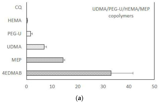 Fine-tuning of the resin by adjusting polymer’s hydrophilicity/hydrophobicity to ensure a desirable ion release, changing ratio(s) of base, diluent, and surface active monomers to control matrix’s viscosity and enhance adhesiveness of the restoration to tooth structures, and selecting polymerization initiators to attain satisfactory levels of DVC, is another approach used in design of ACP composites. Implementation of this approach requires an extensive evaluation of both unfilled resins (copolymers) and the corresponding ACP-filled composites. The results of the evaluation of the experimental remineralizing composites formulated with Bis-GMA, ethoxylated bisphenol A dimethacrylate (EBPADMA) or urethane dimethacrylate (UDMA) as base monomers, triethylene glycol dimethacrylate (TEGDMA), 2-hydroxyethyl methacrylate (HEMA), hexamethylene dimethacrylate (HmDMA), and/or poly(ethylene glycol) extended-UDMA (PEG-U) as diluent monomers, and zirconyl dimethacrylate and/or methacryloyloxyethyl phthalate (MEP) as surface active, adhesion-promoting components are presented in Figure 2.