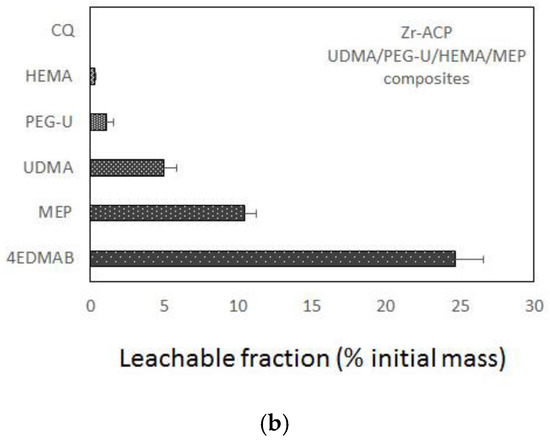 Leachability (acetone extraction; 1H NMR spectroscopy data) of unreacted monomers and constituents of the light-cure initiating system from UDMA-based copolymers (a) and Zr-ACP-based composites (b) formulated for endodontic utility. Indicated values represent mean values + SD for n = 3/experimental group.