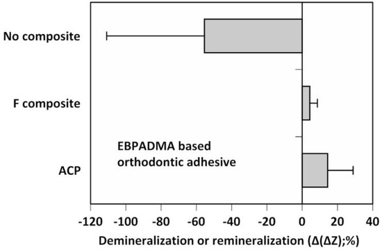 EBPADMA-based composites exhibited greater remineralization activity compared to controls. The overall remineralizing effect of ACP EBPADMA composite was three-fold greater than the remineralizing effect of the fluoride control (mean Δ(ΔZ) values of 14.44% vs. 4.31%, respectively) (Figure 4). However, due to a large data scattering in both experimental groups, this apparent change was found statistically insignificant (p = 0.107). Compared to no-composite controls that exhibited further mineral loss (mean Δ(ΔZ) = −55.44%), remineralizing efficacy of ACP EBPADMA composites was significantly higher (p < 0.05).