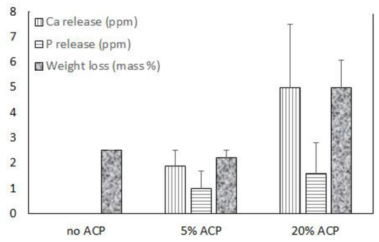 Up to 20 mass % Zr-ACP was successfully incorporated in polymeric nanofibers (Figure 5 and Figure 6). Ion release from the scaffold was accessed as an indicator of the remineralization potential. This aspect was explored in poly-d,l-lactic acid (PDLLA) nanofiber scaffolds containing 0%, 5%, or 20% Zr-ACP. Control composite scaffolds without incorporated ACP exhibited low (2.5%) total weight loss after four weeks of immersion in saline solution similar to 5% ACP PDLLA series. In contrast, 20% ACP PDLLA fibers lost significantly (one-way ANOVA: p < 0.005) more (5% of the initial mass) upon immersion (Figure 5). This relative high weight loss in 20% ACP series, accompanied by the highest Ca and P release, is most likely caused by the more extensive structural decomposition compared to the fibers containing 5% ACP or no-ACP control. This conclusion is further supported by the optical micrographs of the immersed fibers which consistently indicated greater morphological changes in fibers with 20% ACP compared to the ones with 5% or no ACP (data not shown).