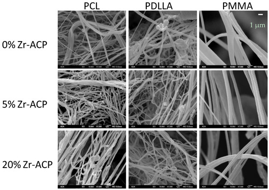 Morphology of airbrushed polymeric nanofiber scaffolds under scanning electron microscope (×7500 magnification). Scaffolds were fabricated using PCL, PDLLA, or PMMA blended with 0%, 5%, or 20% Zr-ACP.