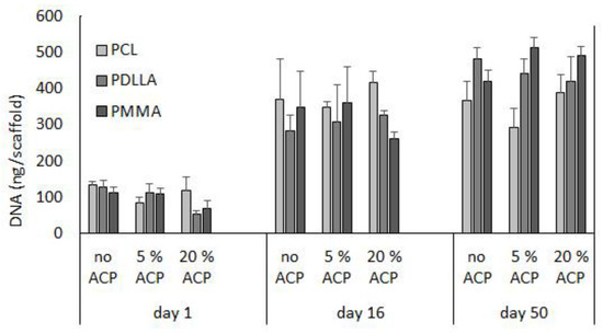 Effect of time (days 1, 16, and 50) and type of polymer (PCL vs. PDLLA vs. PMMA) on cell DNA content in ACP scaffolds vs. no ACP controls. Bar height indicates mean values + SD (n = 3).