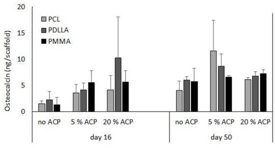Effect of incubation time (days 16 and 50) and type of polymer (PCL vs. PDLLA vs. PMMA) on osteocalcin expression in ACP scaffolds vs. no ACP controls. Bar height indicates mean values + SD (n = 3).