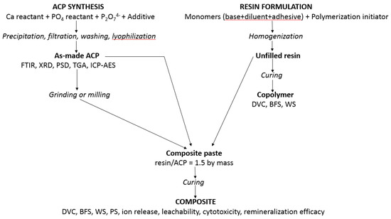 Methods and protocols utilized to synthesize ACP, to validate/characterize fillers and resins, and to evaluate the unfilled resins (copolymers) and their ensuing ACP composites are presented in Figure 9. Detailed descriptions of these methods are provided in [22,32,36,37,38].