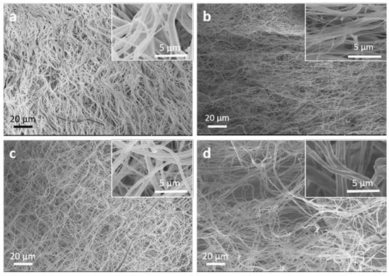 Scanning electron microscope (SEM) images of PCL/aloe vera nanofibers with ratios of (a) 100/0; (b) 90/10; (c) 80/20; and (d) 70/30, respectively. The insets show higher magnification images of the structures shown in the corresponding main SEM images. This figure is reproduced with permission from Carter et al. [97]. Copyright Taylor & Francis, 2016.