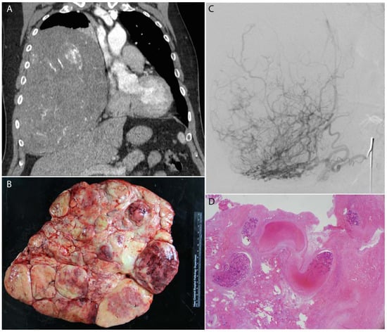 A large benign solitary fibrous tumor of the right pleura (A) was pre-operatively embolized with Gelfoam; (B) surgical resection photograph; (C) angiography of the right phrenic artery demonstrated exuberant vascularity within the mass; (D) histology demonstrates fragments of Gelfoam (acellular pink material) within blood vessels in the mass which is entirely infarcted.