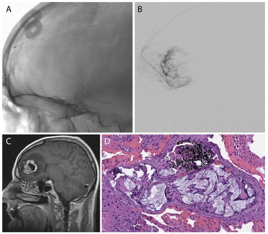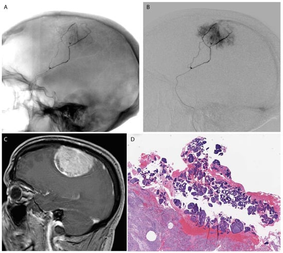 A falcine meningioma was pre-operatively embolized using PVA microspheres. A microcatheter (A,B) was advanced to a branch of the middle meningeal artery supplying the tumor (C). Post-surgical histology shows PVA microspheres within the tumoral tissue (D).