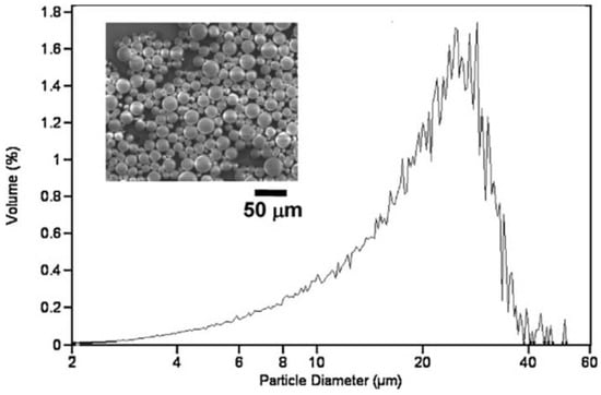 Scanning electron microscopy (insert) and size distribution of poly (lactic-co-glycolic acid) (PGLA) microparticles fabricated through conventional emulsion methods demonstrate a broad range of sizes even after filtering the particles through sieves. Reproduced with permission from [].