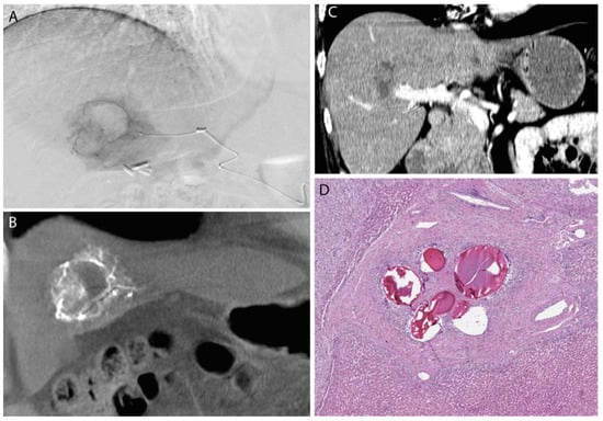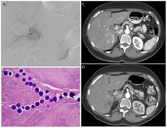 A leiomyosarcoma metastasis to the liver was embolized with 100–300 μm, doxorubicin-eluting microspheres to reduce tumor size and vascularity prior to surgical resection. Selective catheterization (A) of the tumor was performed, with proper positioning confirmed by cone-beam CT (B). Post-procedure CT (C) demonstrates no residual vascularity within the lesion. Following liver resection, microspheres were identified within the blood vessels in the tumor bed without any evidence of viable metastatic tumor (D).