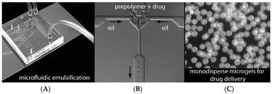 (A) Optical image of a microfluidic chip featuring two parallel droplet formulators. (B) Optical image of an in-line droplet generating nozzle for particle formulation and emulsification. (C) Optical image of a monodisperse population of 10 μm diameter microspheres. Reproduced with permission from []. Copyright (2005) American Chemical Society.