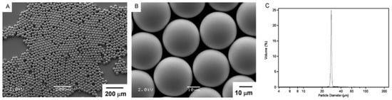Microfluidics systems create monodisperse populations of microspheres. (A,B), scanning electron microscopy shows microspheres produced by microfluidics that are spherical and uniform in size. (C), size distribution chart shows a near “delta” function of particle size, consistent with a monodisperse population. Reproduced with permission from [].