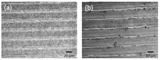 Scanning electron microscopy (SEM) analysis. (a) p-Thr-binding surface; (b) Machined surface. Both groups showed traces of machine tuning. The p-Thr-binding surface had a finer surface structure than the control.