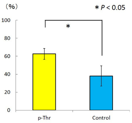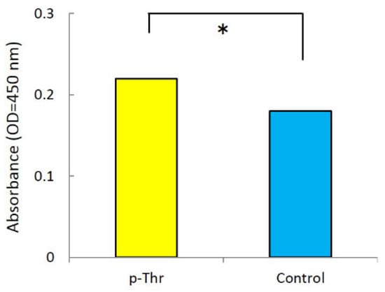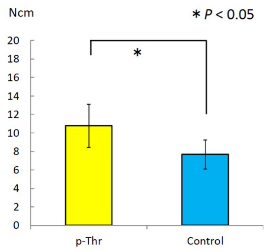 Removal torque (RT) was measured using a digital torque gauge (Figure 3). The RT value was higher in the p-Thr-binding condition than in the control (10.77 ± 2.34 vs. 7.67 ± 1.59 N·cm; P = 0.011).