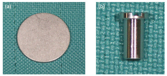 Samples of pure machined titanium. (a) Disk type: diameter = 13.0 mm; height = 1.0 mm; (b) Implant type: diameter = 3.0 mm, length = 5.0 mm.