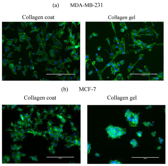 Morphological comparison of different type of breast cancer cell lines cultured on collagen- coated and collagen gel substrates for 3 days. (a) MDA-MB-231 and (b) MCF-7. Immunofluorescence of breast cancer cells were imaged with Hoechst 33342 (blue), phalloidin (green) Scale bar: 200 µm.